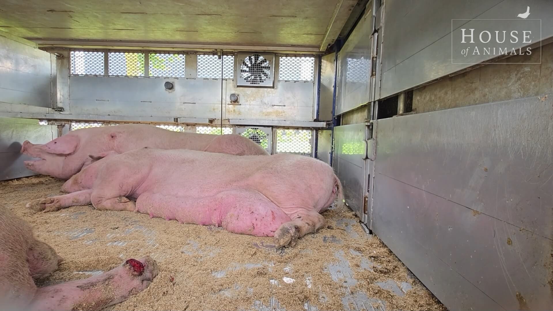Creperende varkens zonder werkende ventilator, wachtend op de slacht tijdens hittegolf | Foto (2025): screenshot video House of Animals/YouTube
